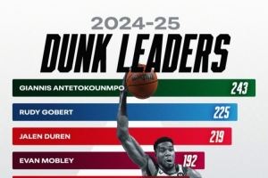 上赛季扣篮榜🔥字母哥领跑戈贝尔第二 阿门&OG是唯二上榜非中锋