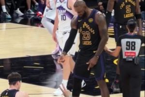 里夫斯投进3+1倒地 詹姆斯数手指卡节奏庆祝后拉起拥抱